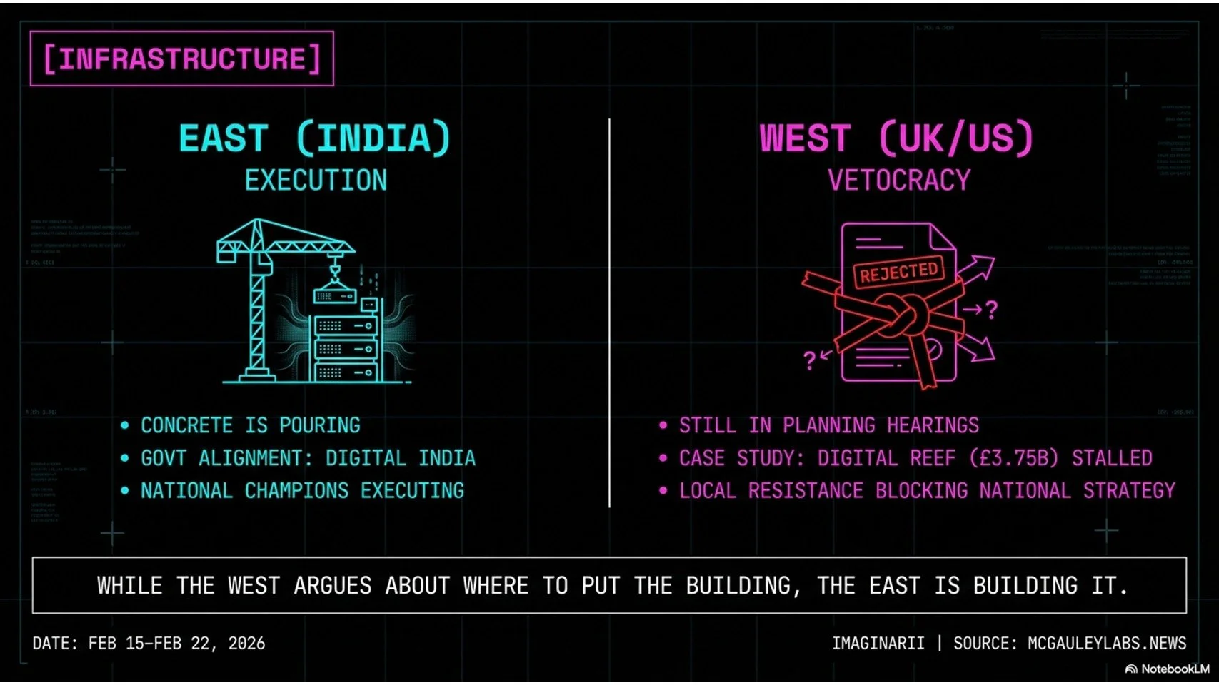 The contrast with the West is stark and getting starker. Digital Reef wants to build a £3.75 billion data center in Havering, UK. It's stalled behind local opposition, zoning regulations, and environmental review timelines that stretch years. In India, because national champions like Adani are operating in alignment with government Digital India policy, concrete is already being poured. Five years from now, when compute availability maps show a massive gap between East and West, this week is where the divergence became permanent.