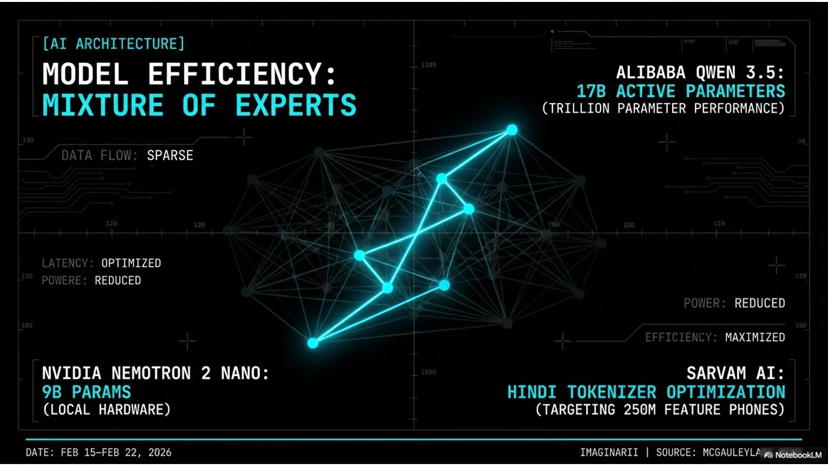 Alibaba's Qwen 3.5 pushed the architecture conversation forward with Mixture of Experts (MoE). The way traditional dense models work, every single parameter fires for every single query — it's a supercomputer calculating 2+2. MoE routes queries to relevant specialist sub-models instead. Ask a Python question, the poet and the historian stay asleep, only the coder wakes up. Qwen 3.5 carries a large total parameter count on paper but actively uses 17 billion per token at runtime. It's not about having a bigger brain anymore. It's about having a better organized one.