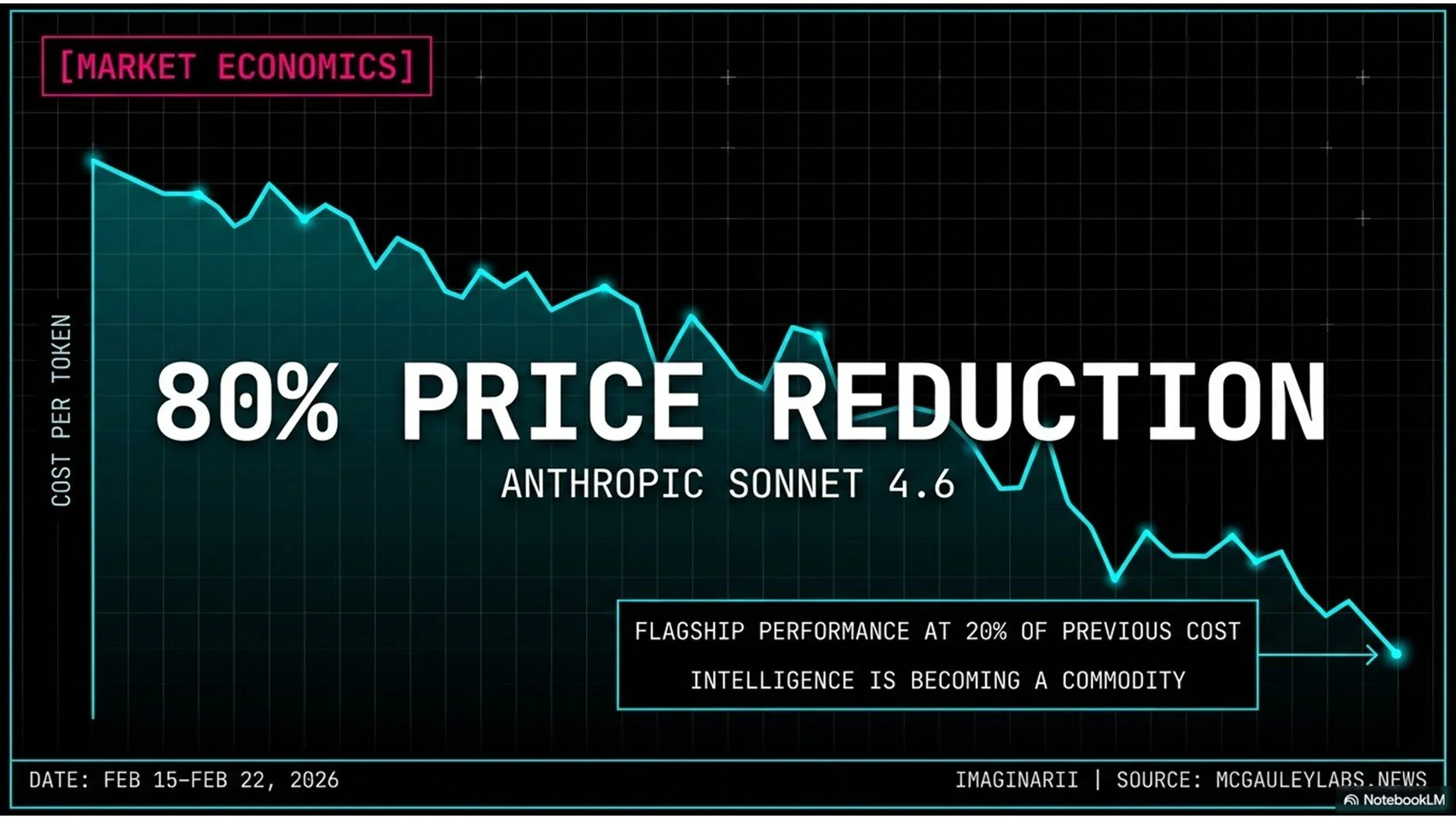 Anthropic released Claude Sonnet 4.6 this week. The number that matters: flagship-level performance at roughly 20% of the previous model's price. That's an 80% reduction. Not over two years of incremental efficiency gains. Now.