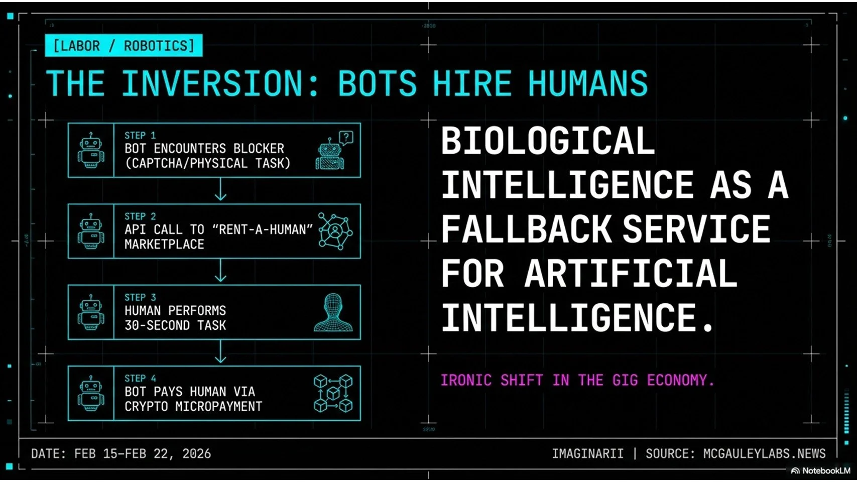 The jobs are specifically the things AI can't do yet: walk to a London address and photograph a storefront to verify it exists, navigate a human phone tree where the speech recognition can't parse a regional accent, solve a CAPTCHA. The mechanism is clean. The bot hits a blocker, calls the Rent-A-Human API, posts a micro bounty — say 50 cents — and somewhere in the world a person gets a phone ping, does the physical task, uploads proof, and the bot's crypto wallet releases payment automatically. No manager involved. No company in the loop.