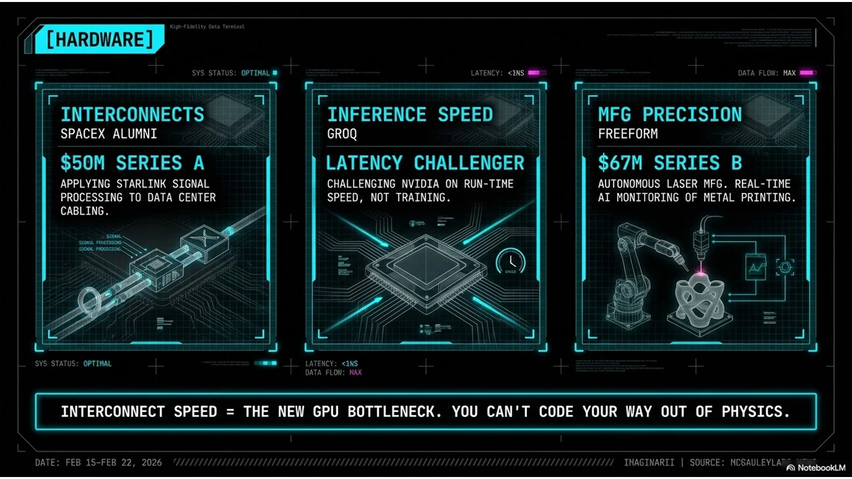 Power is the hard physical limit underneath all of it. PeakXV (formerly Sequoia India) backed a startup called C2i specifically to solve data center power efficiency problems, because in large parts of the developed world, you can't even get a grid hookup before 2031. A group of former SpaceX engineers took that same constraint seriously enough to raise $50 million building faster interconnects — the cables between GPUs in massive training clusters, where a one-nanosecond calculation followed by a ten-nanosecond data transfer leaves your expensive hardware idle 90% of the time. Laser manufacturing startup Freeform raised $67 million applying AI to real-time molecular monitoring during 3D metal printing. All of it points the same direction: the physical layer of AI is being built, fast, and the bottlenecks are concrete engineering problems. The hardware story sets the stage for what's happening to the software pricing underneath it.